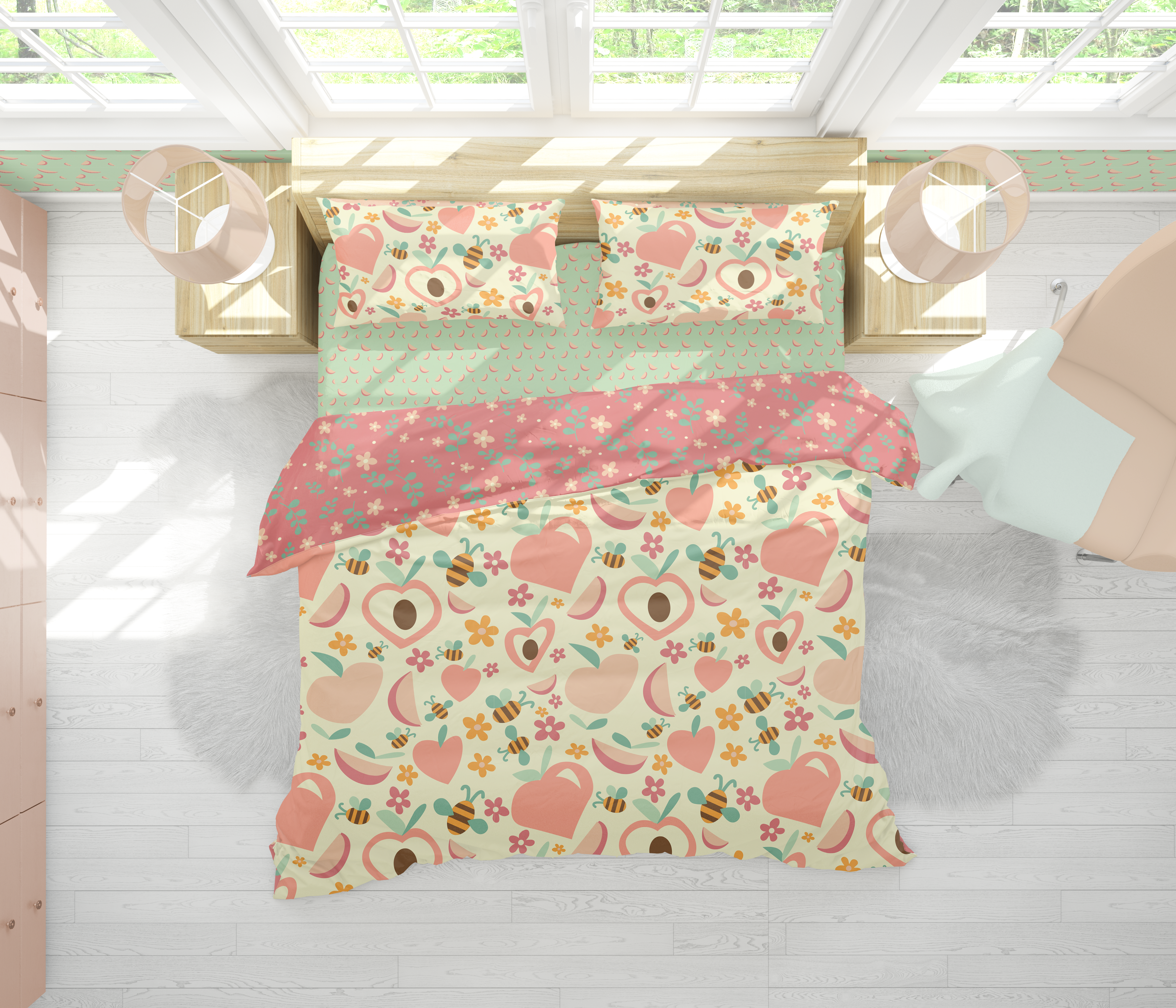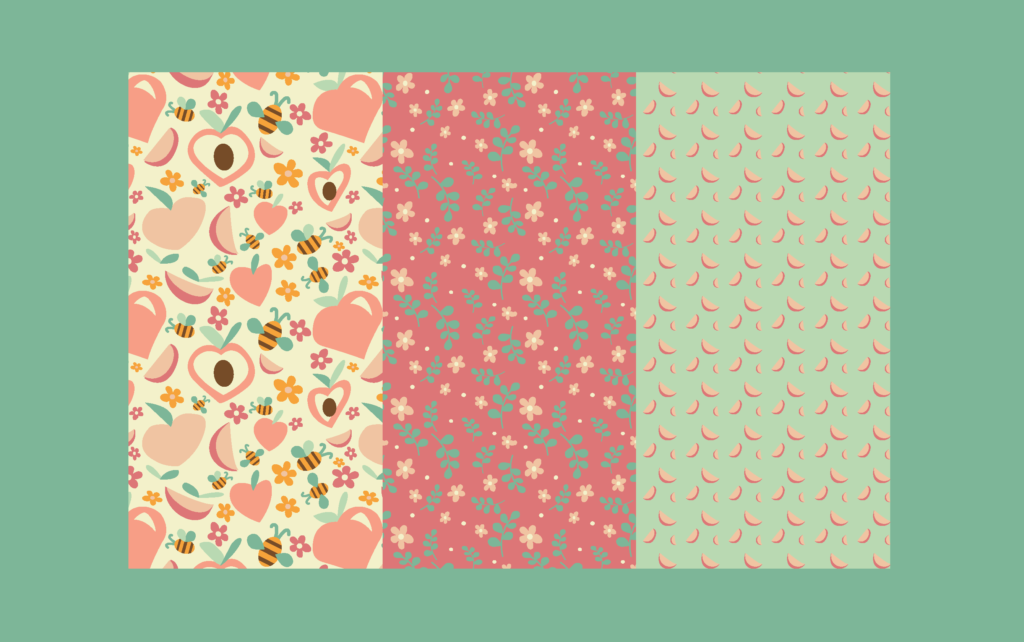 For this project I was asked to create a collection of patterns. I took inspiration from my childhood in Georgia, lots of flowers, bees, and of course peaches. My childhood bedroom was green and pink, so I thought it’d be fun to incorporate those colors. In the end, it resulted in a collection of whimsical patterns that would be perfect for a little girl’s bedroom!