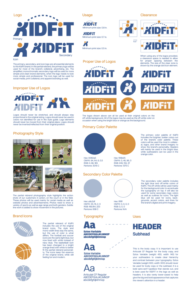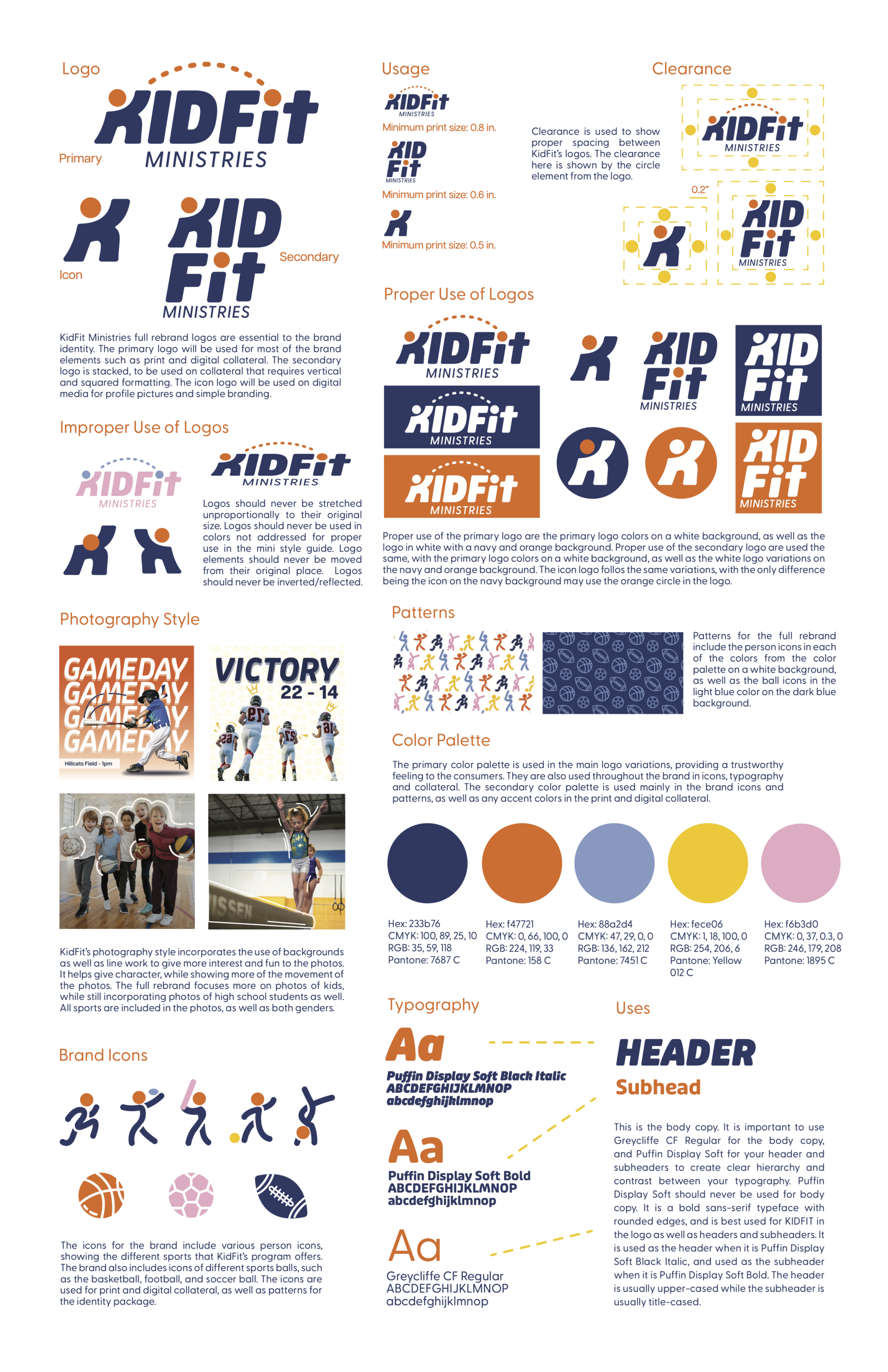 For this project I worked in a group to create a partial rebrand and a full rebrand for the company, KidFit. For the partial rebrand we worked to modernize and simplify the brand so that it would appear more professional. For the full rebrand we made it a little friendlier and more playful to better appeal to younger kids. The result was two different options for a rebrand that we feel would be successful for KidFit to implement!